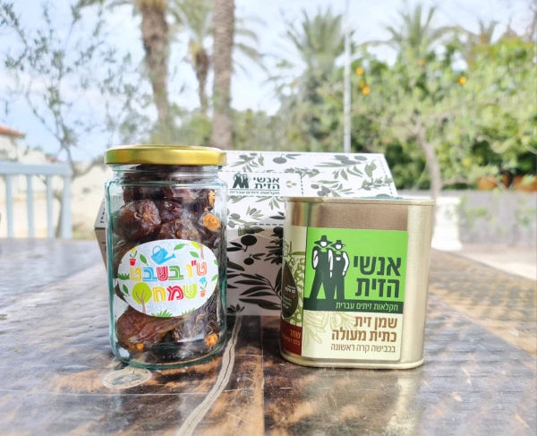 מארז קרטון מעוצב שמן זית כתית מעולה 250 מל ,צנצנת תמרים כ200 גר